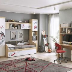 В набор также входит двустворчатый шкаф с отделением для одежды и двумя выдвижными ящиками в нижней части. Шкаф дополняет навесная полка с закрытыми отделениями, в которой удобно разместить учебные пособия или другие вещи.