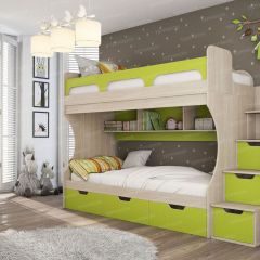 Конструкция кровати предусматривает два спальных места размером 90*190 см каждое. Верхнее спальное место защищено бортиками. Прочную лестницу с широкими ступенями можно установить справа или слева.