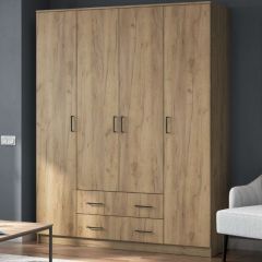 Шкаф комплектуется четырьмя распашными створками и разделен вертикальными перегородками на 3 отделения. По краям располагаются бельевые отделения шириной 384 мм. В каждой из них устанавливается по четыре полки. Посередине отделение шириной 768 мм. В нижней части отделения расположена секция с двумя выдвижными ящиками, в верхней - платяное отделение высотой 1512 мм с одной полкой сверху и металлической штангой.